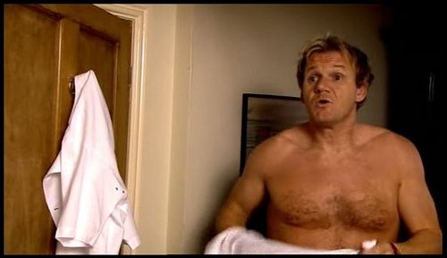 Gordon Ramsey folyamatosan nyomja a rizsát – még öltözés közben is. Így aztán kénytelenek vagyunk végignézni azt is, ahogy a séf szakszerű mozdulatokkal a ruháit hámozza magáról és megvillantja, milyen alapanyagot tud bedobni a lecsóba. Hölgyek, mit szólnak a kínálathoz?
